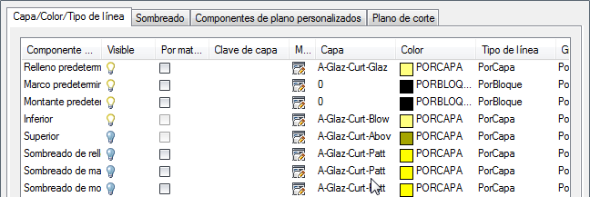 a una altura superior al valor de Altura del plano de corte los objetos se muestran con las propiedades especificadas para el componente Por encima de plano de corte en la ficha Capa/Color/Tipo de línea.