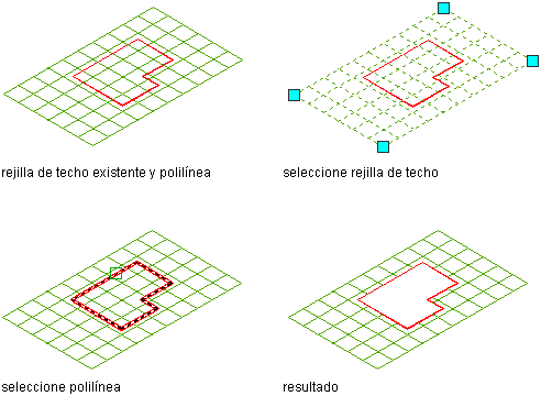 Utilice este procedimiento para crear un agujero en una rejilla de techo. El agujero se crea a partir de un objeto AEC o una polilínea cerrada colocada dentro de los contornos de la rejilla. Cualquier parte de la rejilla que esté dentro del agujero no se muestra.