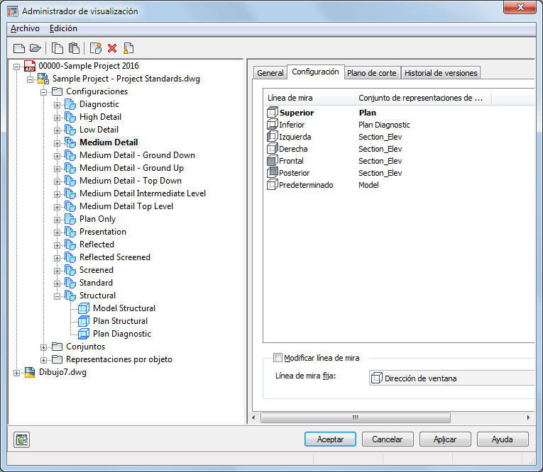 Mediante el Administrador de visualización puede identificarse el conjunto de visualización asignado a cada línea de mira. El Administrador de visualización es una herramienta para administrar los elementos del sistema de visualización. En la ilustración siguiente se muestra un dibujo con dos configuraciones de visualización: Medium Detail y Standard.