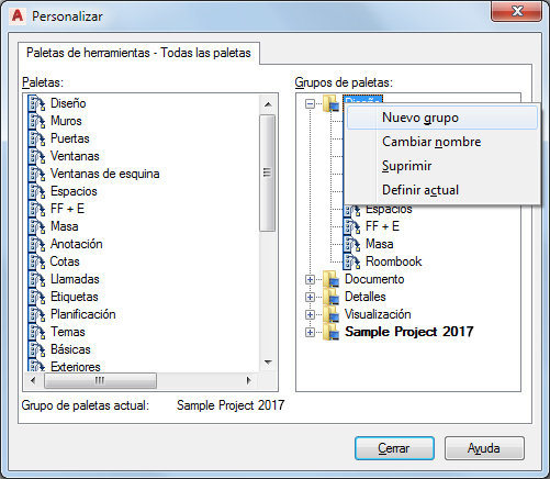 Consejo: El cuadro de diálogo Personalizar puede resultar muy útil para agregar paletas a los grupos de paletas del proyecto.