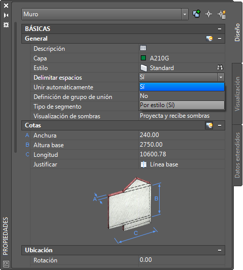 Nota: La propiedad Delimitar espacios no se mostrará al abrir el dibujo en un entorno de activador de objetos de AutoCAD Architecture toolset como, por ejemplo, AutoCAD, Civil 3D o Land Desktop, o cuando ejecute AutoCAD Architecture toolset como AutoCAD. Solo se mostrará en las instalaciones completas de los AutoCAD Architecture and MEP toolsets.