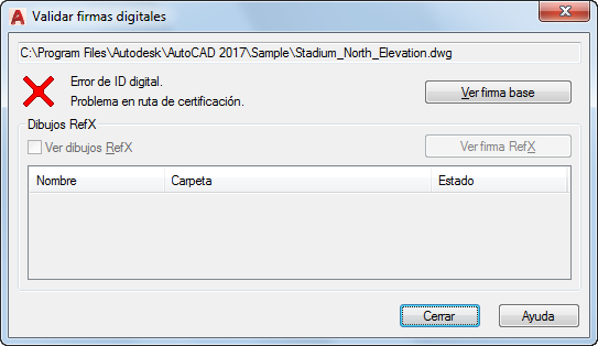 Contiene una lista de los dibujos de referencia externa en un archivo firmado. Esta lista sólo está disponible si el archivo actual contiene alguna refx y se ha seleccionado Ver dibujos RefX.