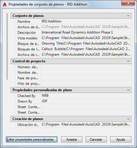 Esto incluye información como la ruta y el nombre de archivo del archivo de datos de conjunto de planos (DST), las rutas de las carpetas que contienen los archivos de dibujo asociados al conjunto de planos y las propiedades personalizadas vinculadas al mismo