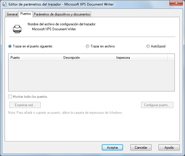 Muestra una lista de los puertos disponibles, tanto locales como de red, y una descripción. Si es un puerto de red, también aparece el nombre de la impresora de la red.