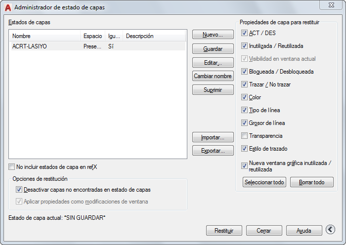 Restituye los parámetros de capa guardados en el estado de capa especificado en función de los parámetros que se encuentren activados en la columna Propiedades de capa para restituir.