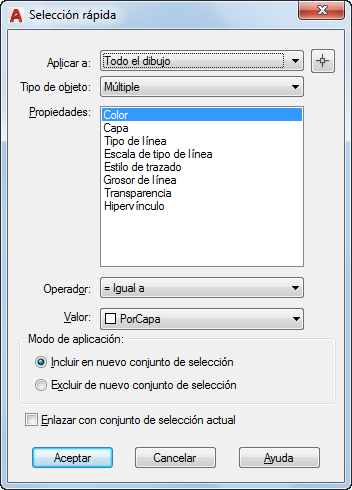 Aplica los criterios de filtro a todo el dibujo o al conjunto de selección actual (si existe).