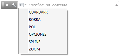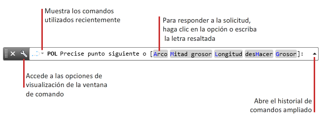 La ventana de comandos, que se puede fijar y cuyo tamaño se puede modificar, acepta comandos y variables de sistema, y muestra solicitudes que permiten completar una secuencia de comandos (incluidos los comandos que se hayan iniciado en otra ubicación como, por ejemplo, la cinta de opciones).