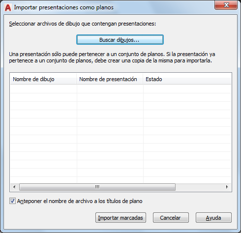 Muestra una lista de todas las presentaciones disponibles en el archivo de dibujo especificado. Active una casilla de selección para elegir una presentación.