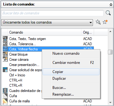 - En la ficha Personalizar, en el panel Lista de comandos, busque el comando que desee copiar.