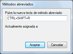 5. En el cuadro de diálogo Métodos abreviados, mantenga pulsada la tecla modificadora Ctrl con una combinación de Mayús, Alt o Mayús y Alt junto con la letra, el número, la función o la tecla virtual (por ejemplo F1 o Insertar) que desee.