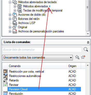 • Para crear un método abreviado, vaya al panel Lista de comandos y arrastre un comando al nodo Métodos abreviados del panel Personalizaciones en <nombre de archivo>.