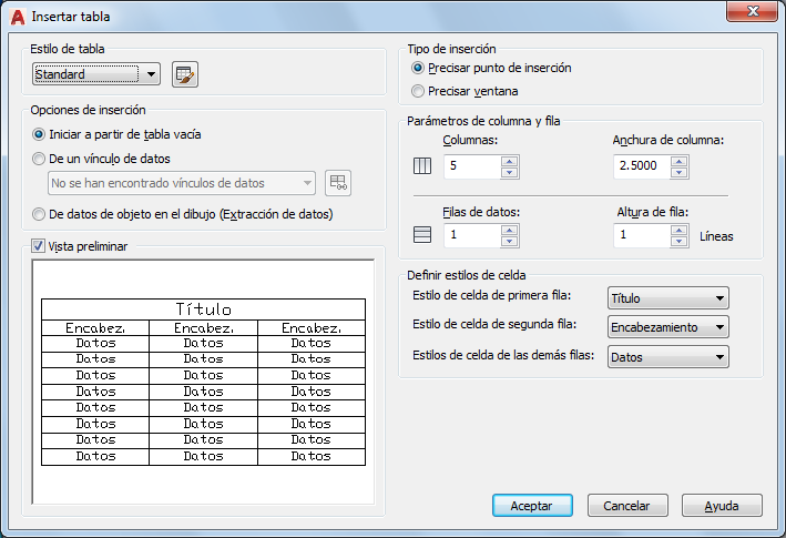Especifica un tamaño y una ubicación para la tabla. Puede utilizar el dispositivo señalador o escribir valores de coordenadas en la solicitud de comando. Si está opción está seleccionada, el número de columnas y filas, la anchura de columna y la altura de fila dependen del tamaño de la ventana y de los parámetros de columnas y filas.