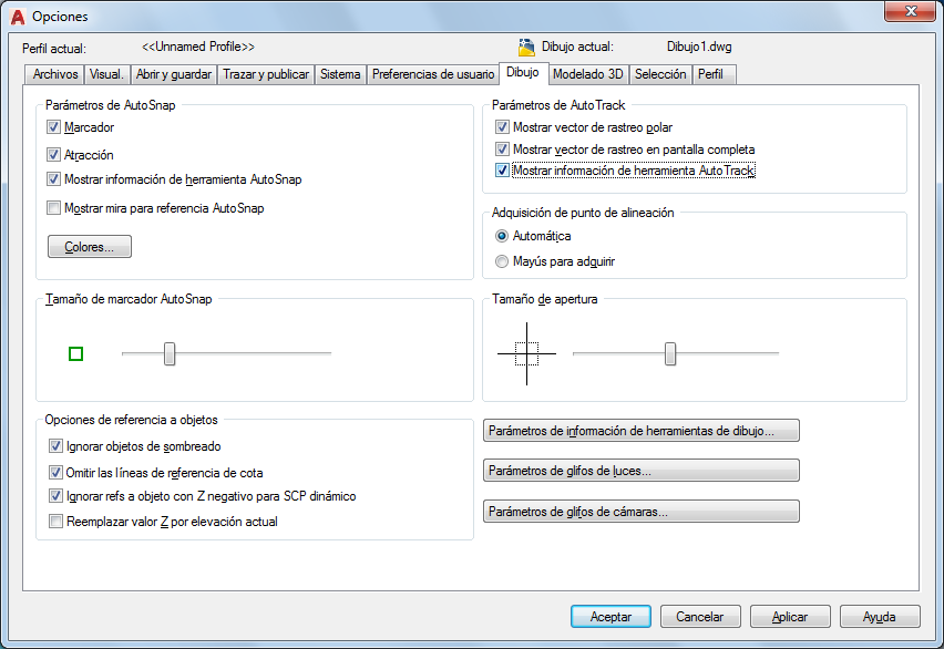 Permite establecer opciones de varias funciones de edición, incluidas AutoSnap y AutoTrack.