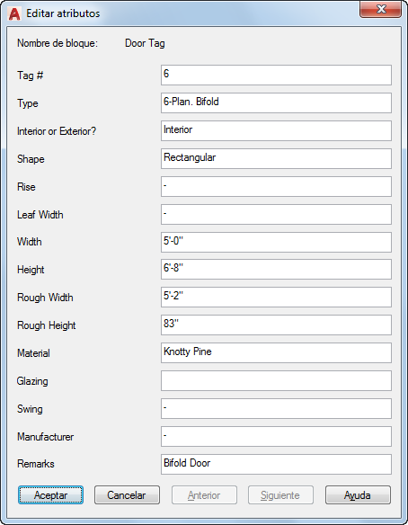Indica el nombre del bloque seleccionado. El valor de todos los atributos incluidos en el bloque se muestra en este cuadro de diálogo.