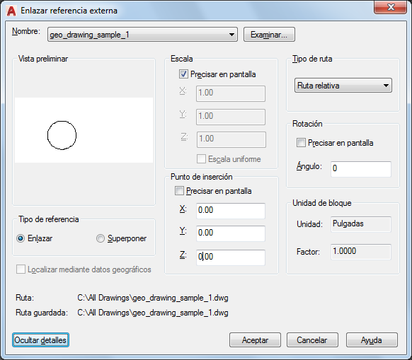 Muestra la ruta que se guarda con el dibujo al enlazar la referencia externa. La ruta depende del parámetro Tipo de ruta.