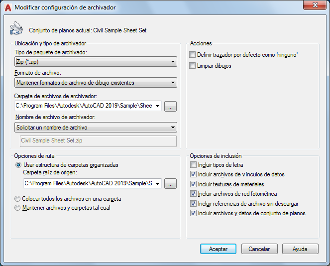 Cambia las rutas, formatos por defecto, organización y otros parámetros para un paquete de conjunto de planos archivado.