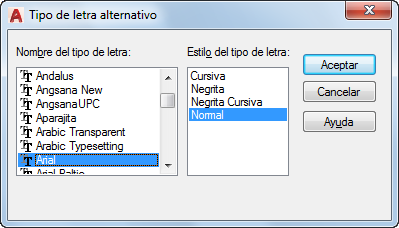 Si no se especifica un tipo de letra alternativo, cuando se abre un dibujo con tipos de letra que no se pueden encontrar, aparece un cuadro de diálogo que permite especificar el tipo de letra que se debe usar para cada tipo de letra no encontrado.