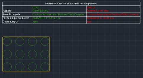 En la siguiente imagen de ejemplo, se muestra la información de propiedades de los dos archivos de dibujo utilizados para la comparación insertada como una tabla en el archivo de resultados de la comparación.