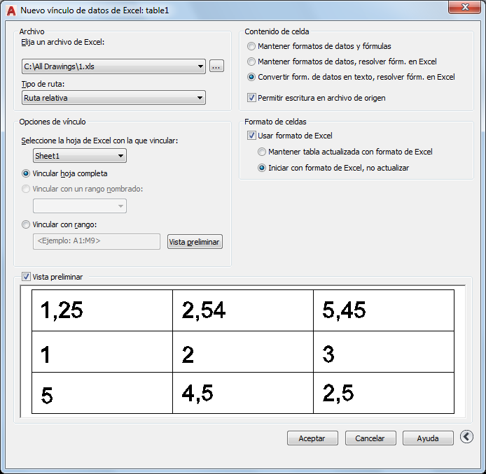 Vincula la hoja completa especificada dentro del archivo Excel a la tabla del dibujo.