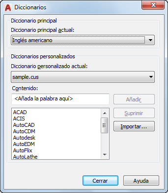 Muestra el nombre del diccionario personalizado actual. La extensión de nombre de archivo .cus se utiliza para los diccionarios personalizados de AutoCAD.