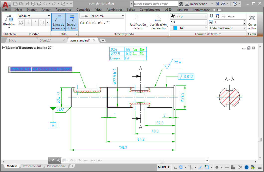 La ficha contextual de la cinta de opciones se muestra a medida que se designan puntos para los vértices de la directriz. Un editor in situ le permite especificar el texto de la nota de igual forma que especifica el texto con el comando TEXTOM. Todas las funciones que estaban disponible con el cuadro de diálogo Símbolo de nota están disponible con la nueva ficha contextual. Si desea continuar utilizando el cuadro de diálogo Símbolo de nota, puede desactivar la ficha contextual estableciendo la variable de sistema AMNOTETAB a 0.