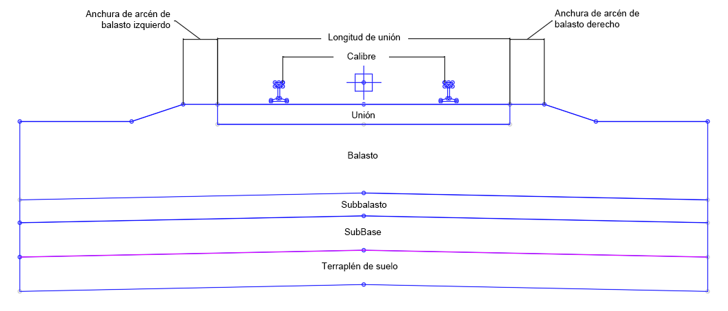 | Pendiente de talud de balasto (izquierdo y derecho) | Talud del lado del material de balasto. El talud de la parte superior del material de balasto coincide con el talud de la unión resultante del peralte de ferrocarriles. | Talud, no negativo | 2:1 |