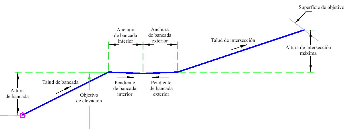 En modo de diseño, este subensamblaje dibuja un talud en desmonte con una bancada.