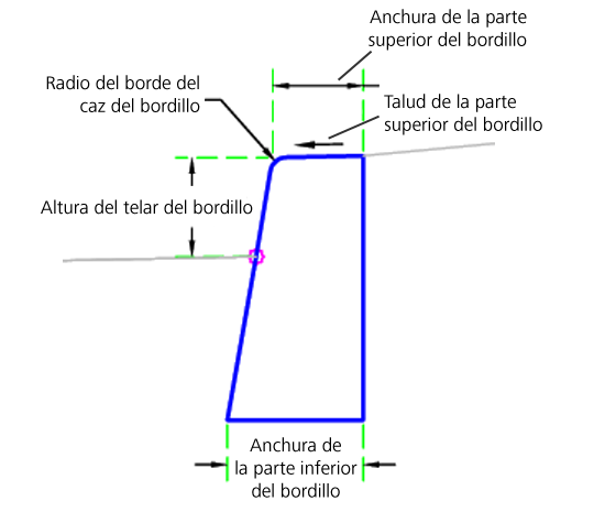 | Talud de la parte superior del bordillo | Talud de la parte superior del bordillo | Numérico, positivo | 50 ( : 1) |