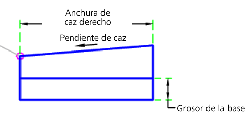 Los vínculos del caz se insertan en función de los parámetros de entrada. Los objetivos pueden modificar el borde exterior del caz transversal en los lados derecho e izquierdo. Si el grosor de la base es mayor que 0, se generará la base en el caz transversal.