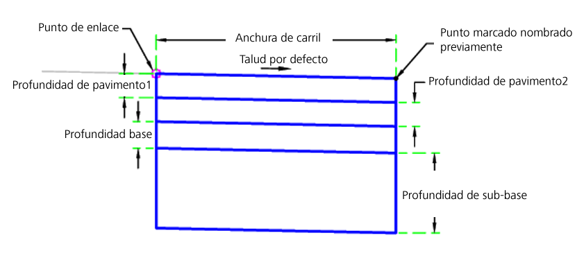 | Punto de inserción | Permite especificar el punto de inserción del carril en el bombeo o en la arista de la calzada | Bombeo / BordeDeCalzada | Bombeo |