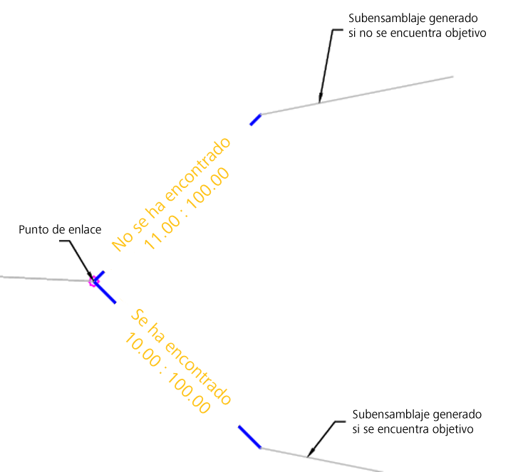 | Condición | Permite especificar la condición disponible para este subensamblaje. Se procesa la condición Encontrado si el objetivo del desfase se encuentra dentro de la distancia máxima. Se procesa la condición No encontrado si no se ha establecido el objetivo de desfase o no se encuentra en el P.K. dentro de la distancia máxima. | Encontrado/no encontrado | Encontrado |