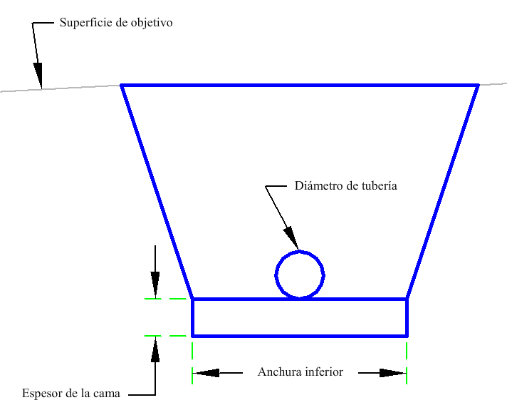 | Anchura inferior | Anchura inferior de la zanja de tubería | Numérico, positivo |