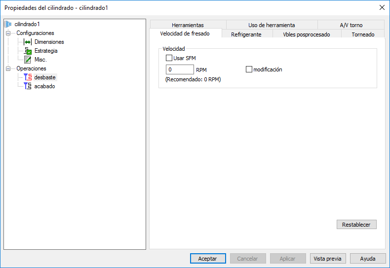 La sección de Velocidad determina cómo de rápido se mueve la herramienta. Las unidades por defecto son RPM (revoluciones por minuto). Existe la posibilidad de seleccionar Usar SFM (pies de superficie por minuto) para cambiar de unidades. FeatureCAM utiliza el valor de velocidad Recomendado por defecto. Existe la posibilidad de introducir un valor diferente, que selecciona automáticamente la opción de Modificación. Si desea restablecer los valores recomendados, desactive Modificación.