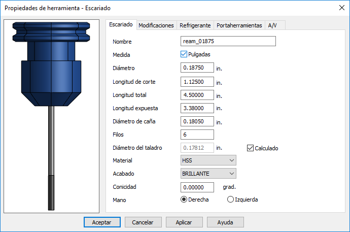 Acabado — El revestimiento, o acabado, de la herramienta. Esta información también se emplea en el cálculo de avances y velocidades. Si hay una tabla de avance/velocidad para un material cortado con una herramienta de acabado BRILLANTE, pero no de acabados TI_N u ÓXIDO_NEGRO, los valores de velocidad se calculan a partir de la tabla de BRILLANTE. La velocidad para TI_N es 1,5 veces la velocidad de BRILLANTE. La velocidad para el ÓXIDO_NEGRO es 1,05 veces la velocidad de BRILLANTE. Las velocidades de avance son iguales que las velocidades de avance de BRILLANTE.
