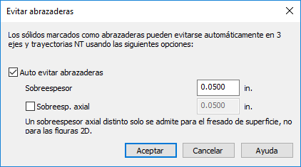 Sobreesp. axial — Para configurar sobreespesores axiales y radiales independientes, seleccione esta opción e introduzca la distancia axial (XY) mínima que desee dejar alrededor de las abrazaderas. Cuando se activa Sobreesp. axial, el valor de Sobreespesor se aplica exclusivamente a la distancia radial (Z).
