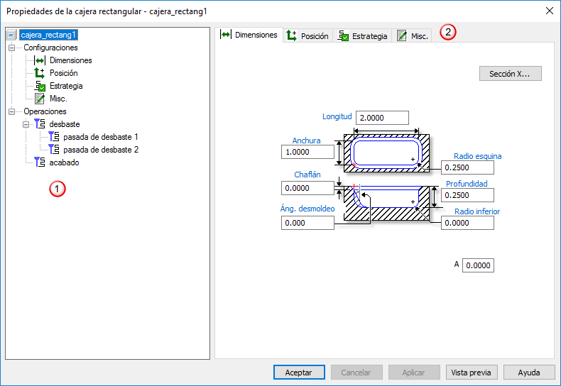 La vista de árbol recoge las operaciones y pasadas de la figura. Las pestañas abiertas en el cuadro de diálogo cambian en función del nivel de la vista de árbol seleccionada.