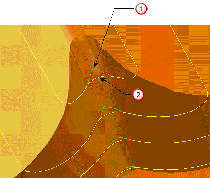 Las pasadas en el nivel Z (de desbaste y acabado) puede ajustarse por arcos para evitar cambios bruscos en la dirección. Para el desbaste en Z, solo se redondea la trayectoria más cercana a la pieza. % Radio de esquina define el radio que se inserta en las trayectorias de herramienta.