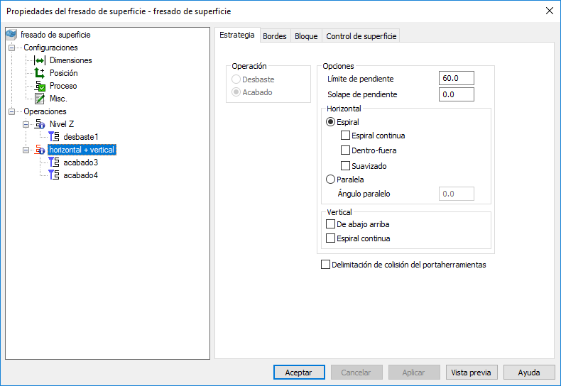 Espiral continua — Active esta opción para detener la levantada de herramienta de la superficie durante el mecanizado.