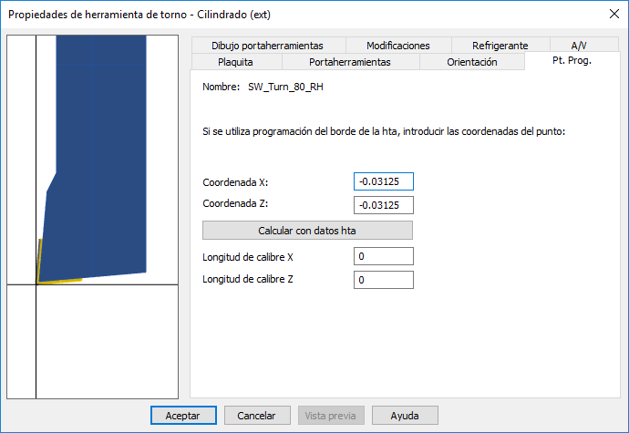 En la pestaña Pt. prog. (punto de programa) es posible definir el punto de la plaquita que se ha programado. Existe la posibilidad de definir tanto la Coordenada X como la Coordenada Z.