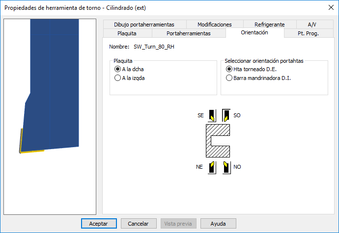 En la pestaña de Orientación es posible configurar la orientación del portaherramientas en la máquina y la lateralidad de la herramienta.