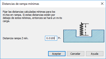 Es posible utilizar el cuadro de diálogo de Distancias de rampa mínimas para asignar una distancia de rampa Z mínima, por debajo de la que tienen lugar los movimientos de carga.