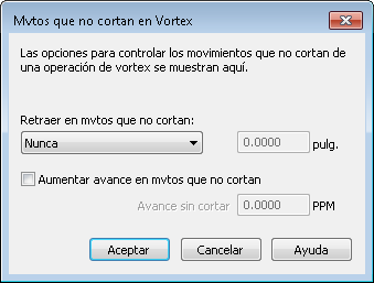 Utilice el cuadro de diálogo de Mvtos que no cortan en Vortex para indicar si se utiliza la retracción y si se aumenta el avance en los movimientos que no cortan.