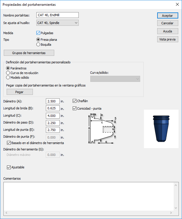 Diámetro de herramienta — El diámetro de la herramienta. En las boquillas, se le puede asignar un valor máximo y mínimo, para reflejar con precisión las boquillas reales. También se le puede asignar el valor de Ajustable, para que el diámetro se adapte a cualquier herramienta de diámetro menor que el Diámetro de punta.