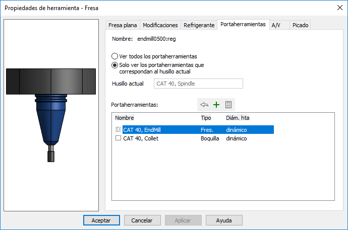 Seleccione Ver solo portahtas según husillo actual para ocultar los portaherramientas que no sean compatibles con el husillo actual. Seleccione Ver todos los portahtas para visualizarlos todos.