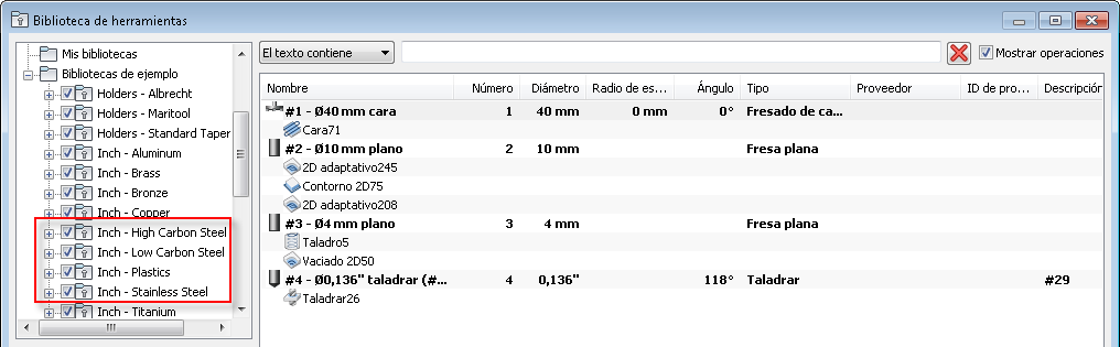 Por ejemplo: al seleccionar la carpeta Por tipo > Fresa redondeada, solo se muestran las herramientas redondeadas.