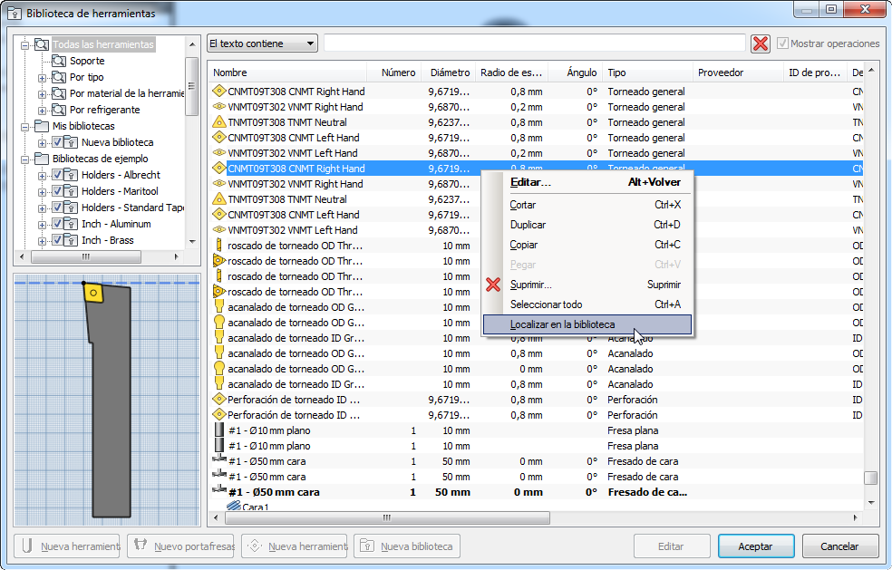 Cuando se utiliza la función Buscar en carpeta, es posible que necesite abrir la biblioteca correspondiente donde está almacenada una herramienta determinada. Haga clic con el botón derecho en la herramienta y elija Localizar en la biblioteca en el menú contextual emergente.