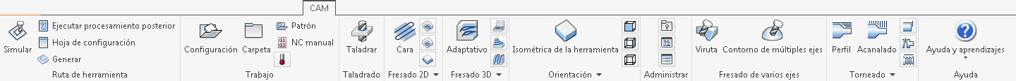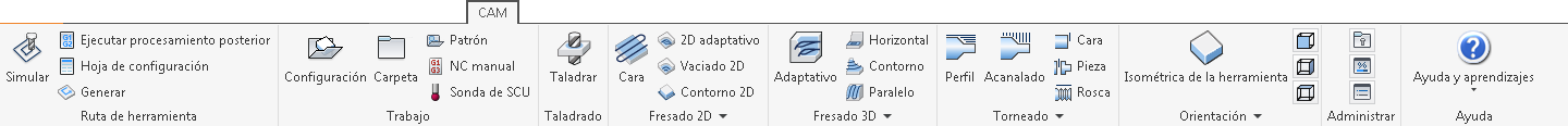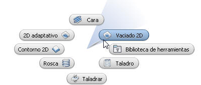 Para crear la primera operación de mecanizado, basta con seleccionar cualquiera de las estrategias de ruta de herramienta en la barra de herramientas de CAM. El tipo de ruta de herramienta necesario depende naturalmente de la geometría de la pieza. Para obtener una descripción de las estrategias de mecanizado individuales, consulte el tema de la Ayuda de Autodesk HSM: Acerca de las estrategias de mecanizado 2D y Acerca de las estrategias de mecanizado 3D.