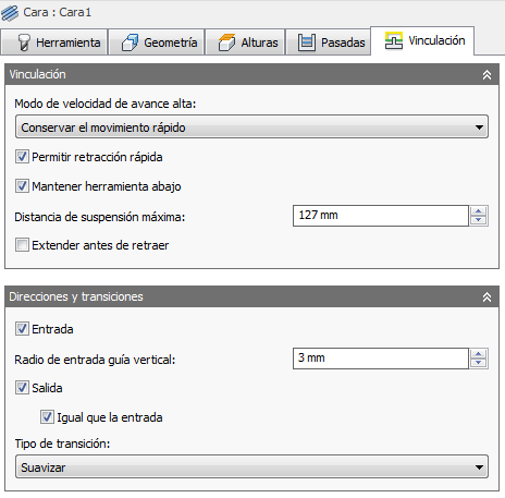 Radio del arco vertical que suaviza el movimiento de entrada a medida que avanza hasta la propia ruta de herramienta.