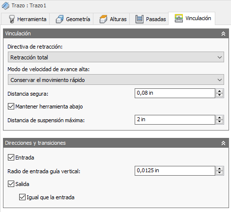 Radio del arco vertical que suaviza el movimiento de entrada a medida que avanza hasta la propia ruta de herramienta.