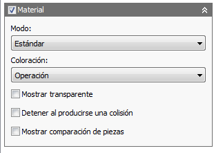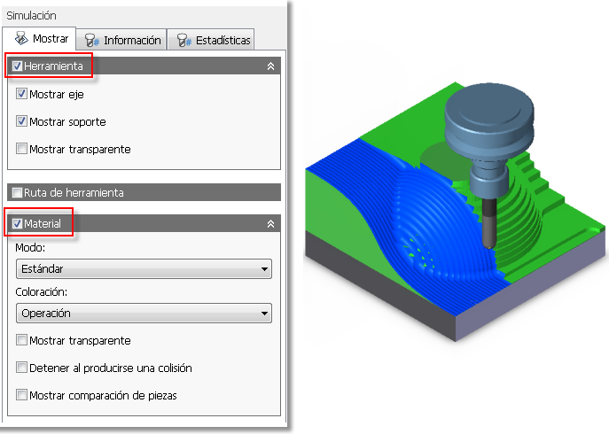 Además de la simulación normal, puede activar la casilla de verificación Material para mostrar material dentro de la simulación normal. También es posible mostrar la herramienta, la ruta de herramienta y el material de forma individual o juntos. Para ello, active o desactive las respectivas casillas de verificación Herramienta, Ruta de herramienta y Material.